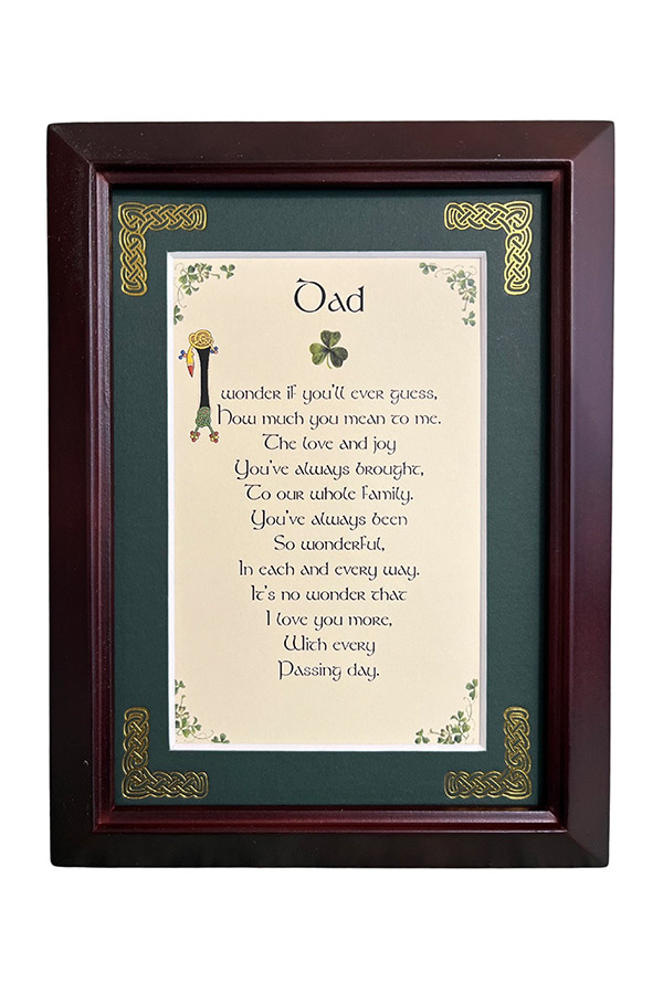 Features - Our blessings are printed on an ivory card, and are presented in a forest green matting with gold Celtic knots, embossed on the corners. Set behind glass and displayed in an elegant dark walnut frame of Italian design. The backing has a hanger and an attached easel to allow for both wall and tabletop display. Each frame comes individually boxed in a bubble wrap sleeve.