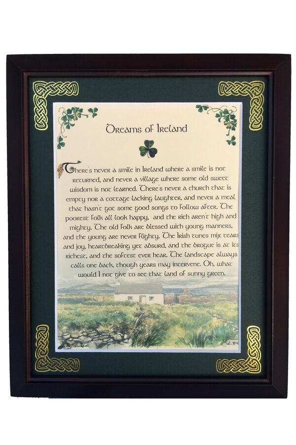 Features - Our blessings are printed on ivory card, and are presented in a forest green matting with gold Celtic knots embossed on the corners. Set behind glass and displayed in a elegant dark walnut frame of Italian design. The backing has a hanger and an attached easel to allow for both wall and tabletop display. Each frame comes individually boxed in a bubble wrap sleeve.