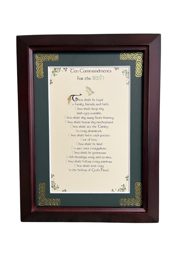 Features - Our blessings are printed on an ivory card, and are presented in a forest green matting with gold Celtic knots, embossed on the corners. Set behind glass and displayed in an elegant dark walnut frame of Italian design. The backing has a hanger and an attached easel to allow for both wall and tabletop display. Each frame comes individually boxed in a bubble wrap sleeve.