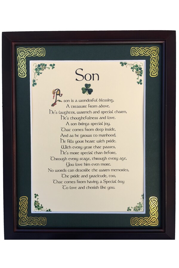Features - Our blessings are printed on ivory card, and are presented in a forest green matting with gold Celtic knots embossed on the corners. Set behind glass and displayed in a elegant dark walnut frame of Italian design. The backing has a hanger and an attached easel to allow for both wall and tabletop display. Each frame comes individually boxed in a bubble wrap sleeve.