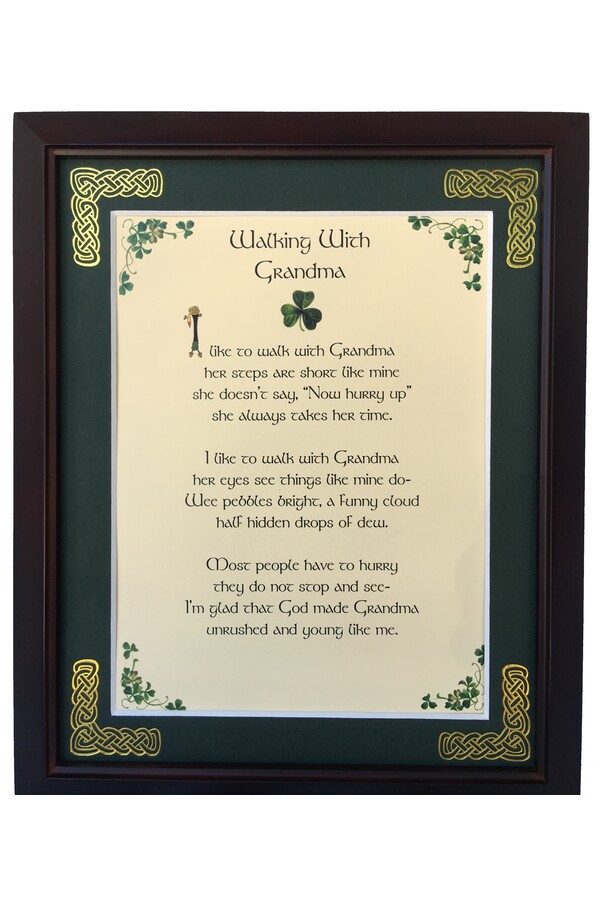 Features - Our blessings are printed on ivory card, and are presented in a forest green matting with gold Celtic knots embossed on the corners. Set behind glass and displayed in a elegant dark walnut frame of Italian design. The backing has a hanger and an attached easel to allow for both wall and tabletop display. Each frame comes individually boxed in a bubble wrap sleeve.