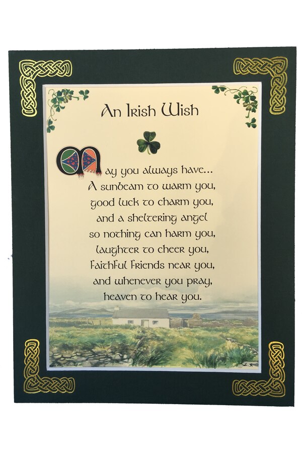 Features - Our blessings are printed on ivory card and are presented in a forest green matting with gold Celtic knots embossed on the corners. Presented in a clear with a craft card backing in a resealable bag.