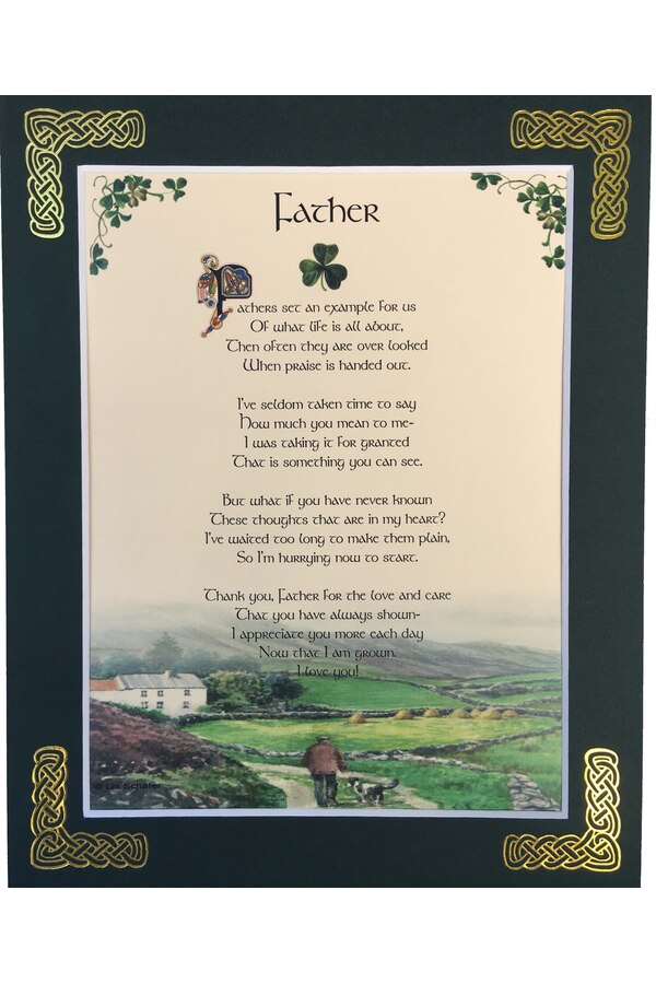 Features - Our blessings are printed on ivory card and are presented in a forest green matting with gold Celtic knots embossed on the corners. Presented in a clear with a craft card backing in a resealable bag.